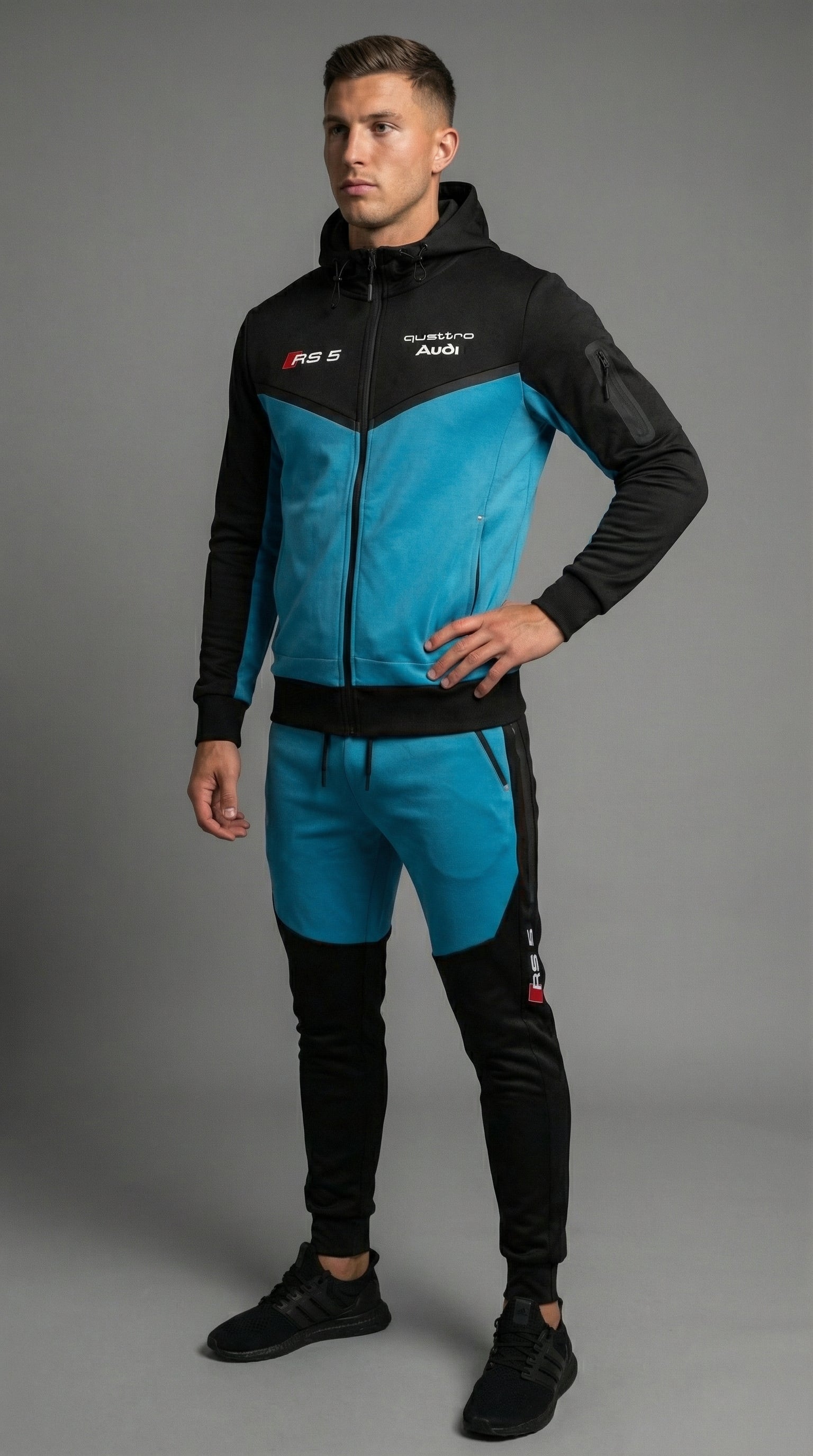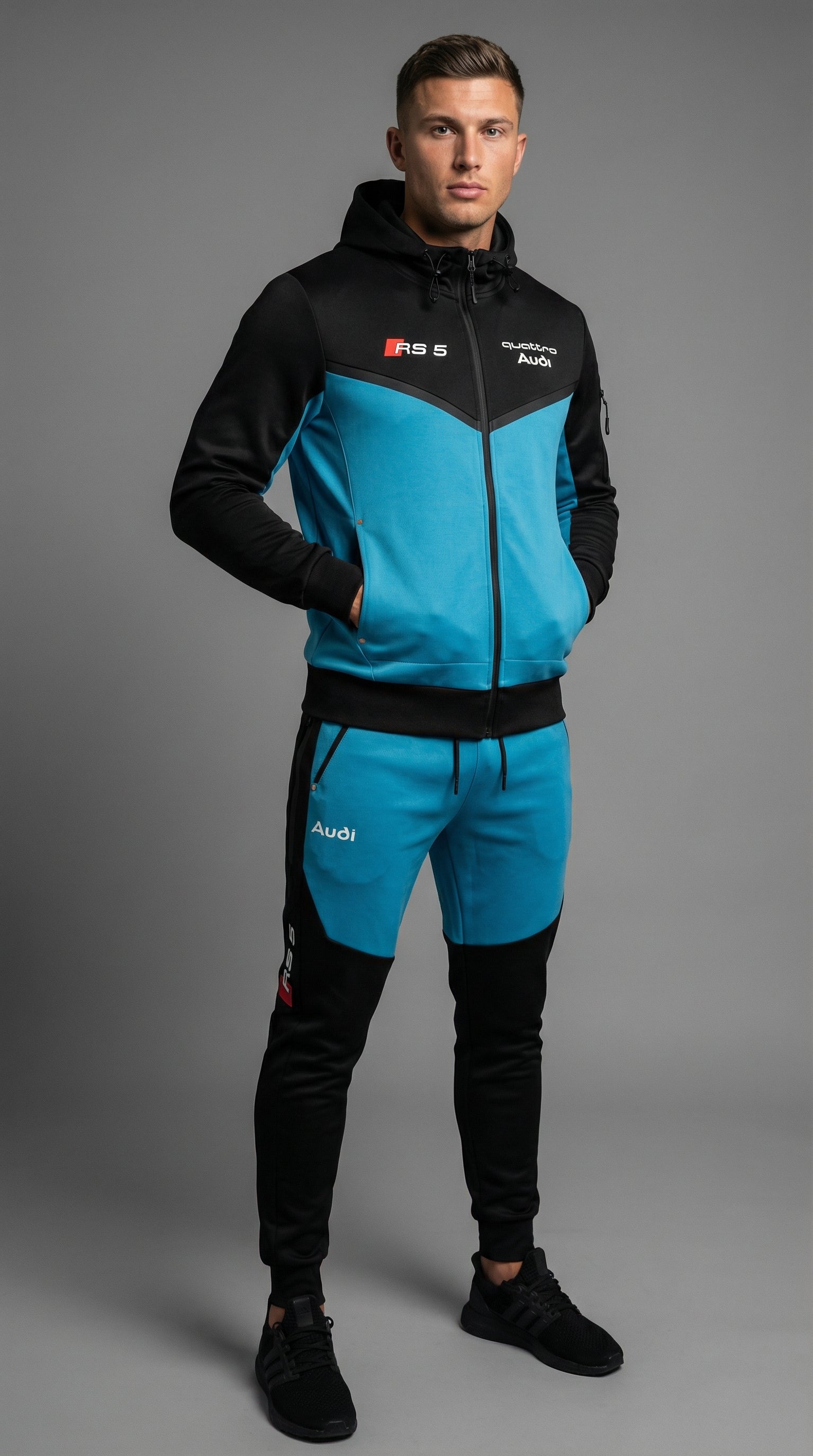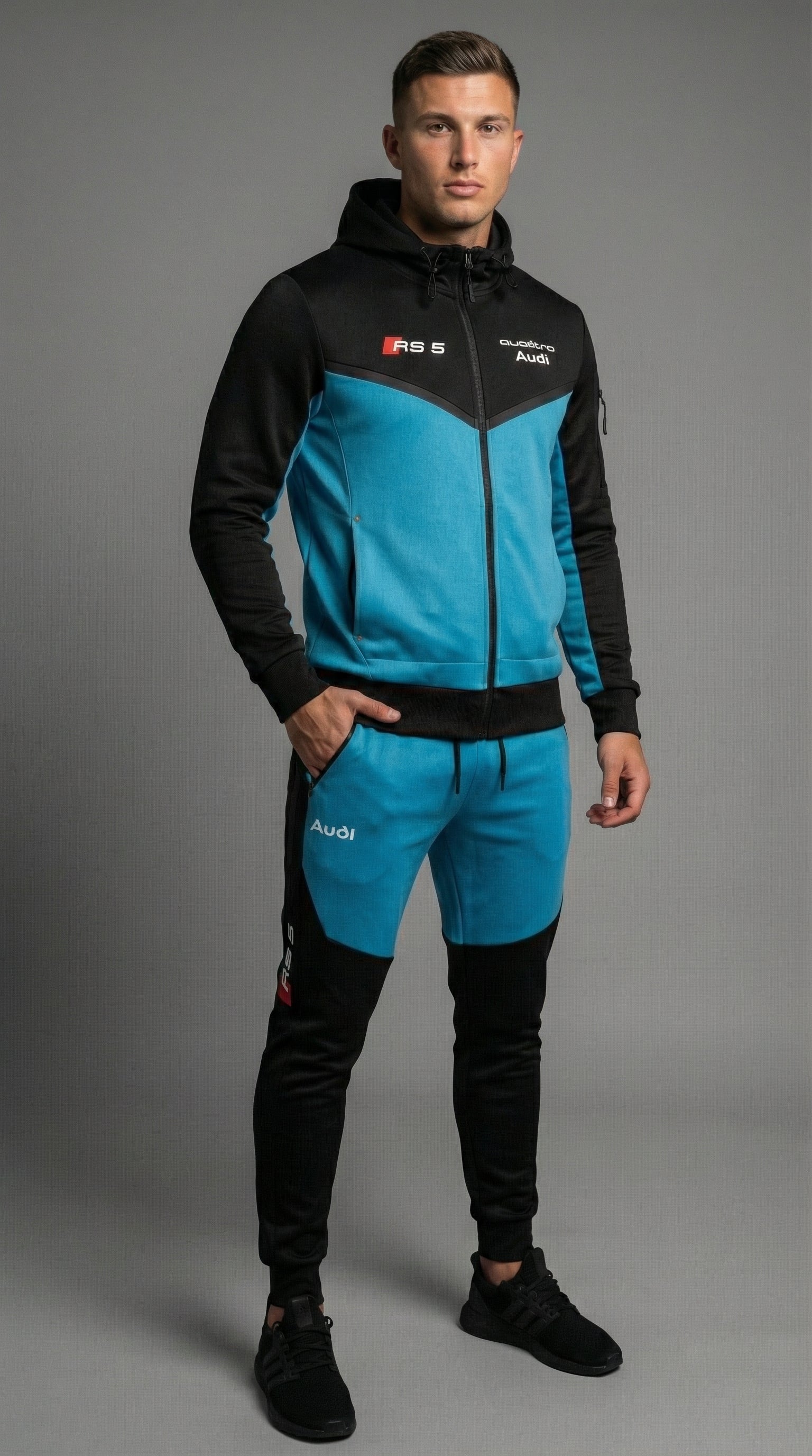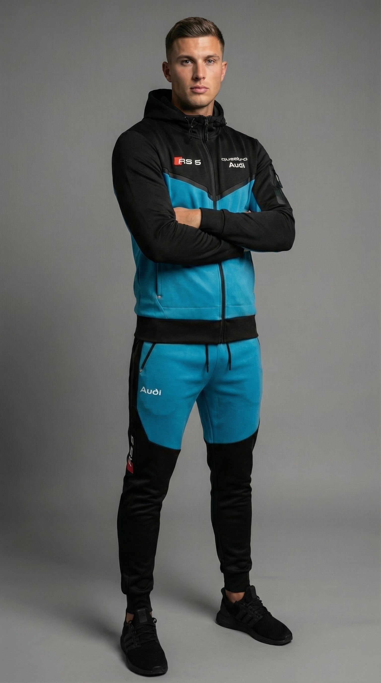 Texte alternatif : Un mannequin porte le survêtement noir élégant orné du logo Audi RS5, mettant en valeur sa coupe confortable et son design stylé.